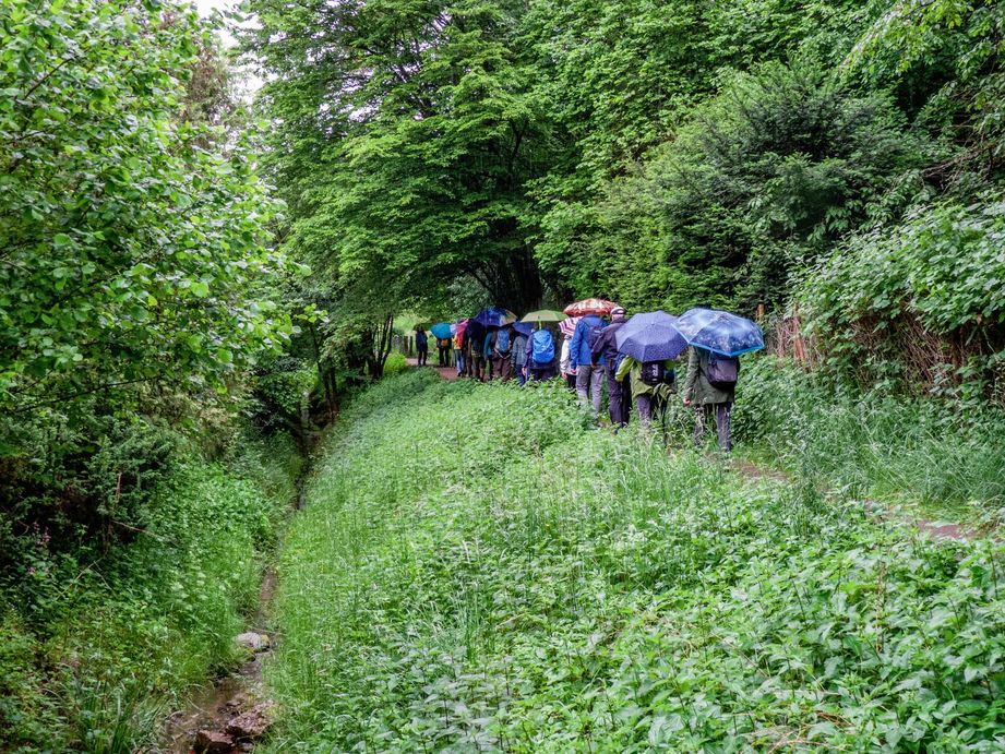 Vom Stadtbahnhalt „Stelle“ der U 15 wanderten wir parallel zur Tiefenbachschlucht zum idylischen Tiefenbachsee mit schon gelb blühenden Seelilien. Unterhalb von Weinbergen gelangten wir in den noch dörflichen Stadtteil Rohracker. An einer Jugendfarm vorbei ging’s nun Richtung Lederberg und Heumaden, wo wir – vor dem einsetzenden Regen – tolle Ausblicke Richtung Rotenberg, Uhlbach und den Esslinger Stadtteilen Rüdern und Krummenacker hatten. Der originelle 1. Stuttgarter Mostbesen