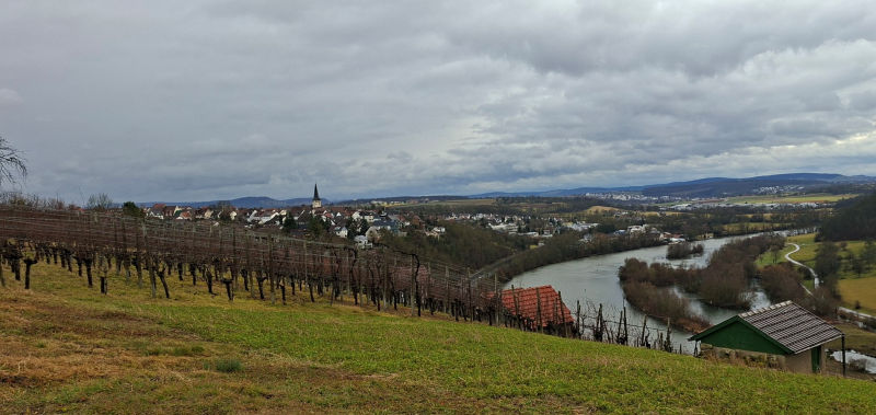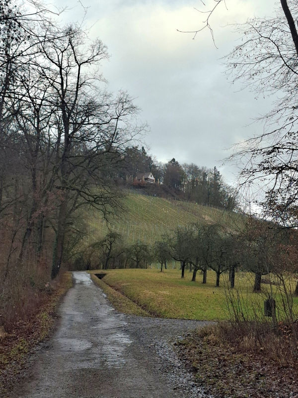 Da Bäume und Sträucher noch kahl sind, erleichtert uns das die Aussicht. Man muss halt auch die Vorteile einer Wanderung so zeitig im Jahr sehen. Weiter geht es es oberhalb der Neckarschleife und oberhalb von Weinbergen mit weitem Blick ins Land – über Hoheneck, Neckarweihingen und Richtung Ludwigsburg. Entlang der nächsten Weinberge – hier macht der Weinwanderweg seinem Namen alle Ehre – kommen wir nach Poppenweiler. Auf dem letzten Abschnitt haben wir dann den Lemberg im Blick. Den umrunden wir und kommen nach Affalterbach, unserem Ziel.